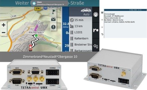 TETRAcontrol UBX wird an das Fahrzeug-Funkgerät angeschlossen und ermöglicht vielfältige Kommunikationsmöglichkeiten, Steuerungsfunktionen und Datenaustausch. Die wichtigsten Funktionen sind Statusweiterleitung, Funkbedienung und Navigations-Anbindung.
